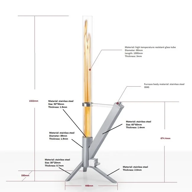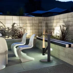 Met zijn slanke, verticale vormgeving neemt de Rocket Heater weinig ruimte in beslag, terwijl de matte zwarte stalen constructie een stoere, industriële uitstraling geeft. De glazen buis laat de vlammen prachtig dansen – een echte sfeermaker voor iedere tuin.